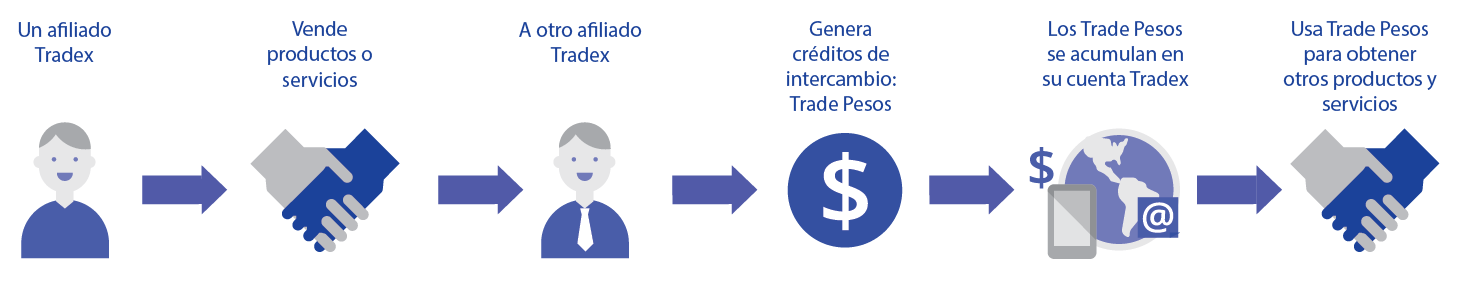 El intercambio comercial que impulsamos en Tradex es un negocio simple con un toque extraordinario: a través de nuestro sistema puede comprar y vender bienes o servicios utilizando créditos de intercambio. Esto significa que no necesita usar efectivo para comprar. Los créditos de intercambio se obtienen al vender sus propios productos o servicios a otros afiliados.